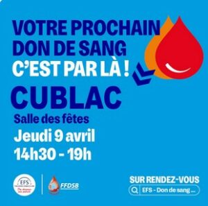 L’Établissement français du sang organise une collecte jeudi 9 avril, de 14h30 à 19 heures, à la salle polyvalente de Cublac (changement, au lieu de la salle des fêtes de Terrasson). Prise de rendez-vous sur dondesang.efs.sante.fr ou par téléphone au 05 55 74 98 00.