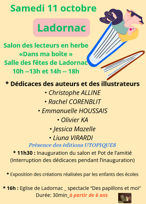 Le salon des Lecteurs en Herbe à Ladornac, samedi 11 octobre 2025, toute la journée avec les auteurs et illustrateurs du livre jeunesse invités dans les écoles jeudi 9 et vendredi 10 octobre, avec un spectacle le samedi à 16h « Des papillons et moi » à voir dès 6 ans en l’église de Ladornac.