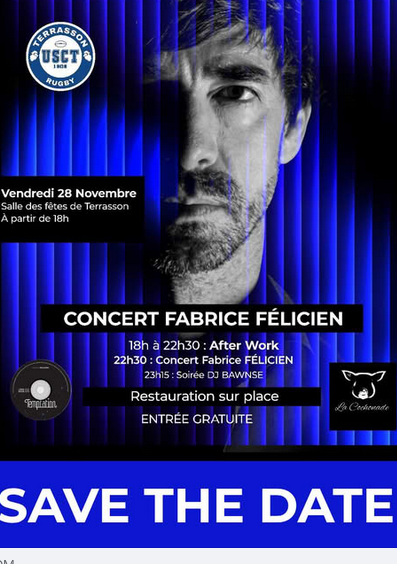 Fabrice Félicien, chanteur originaire de Terrasson, auteur, compositeur, organise un concert gratuit le vendredi 28 novembre pour les Terrassonnais. Chacun peut venir le soutenir et découvrir ses chansons de style pop folk en anglais à la salle des fêtes de Terrasson. Entrée libre. 18h Cochonade after work pour ceux qui le souhaitent, et 22h30 soirée gratuite concert + DJ… Le jeune chanteur terrassonnais a besoin du soutien d’un maximum de Terrassonnais pour lancer son premier EP « Temptation« ….