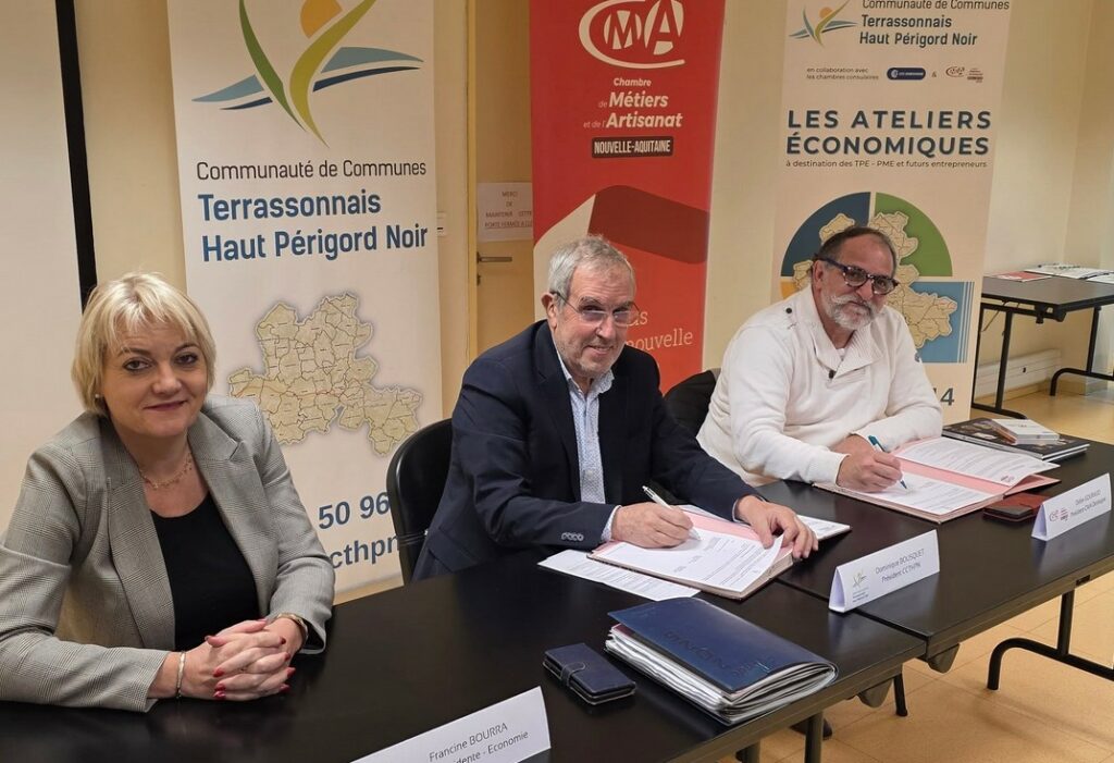 La communauté de communes du Terrassonnais Haut Périgord Noir (CCTHPN) attaque une nouvelle saison d’ateliers économiques pour renforcer l’attractivité du territoire auprès des artisans, commerçants et porteurs de projets. Dominique Bousquet, président de la CCTHPN, et Didier Gouraud, président de la Chambre de métiers et de l’artisanat (CMA), ont signé un nouveau partenariat.