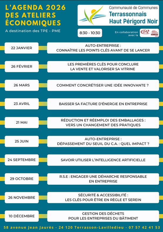 Gratuits pour les participants, ces ateliers se déroulent au rez-de-chaussée du siège de la CCTHPN en face de la gare de Terrasson. Ils sont financés par la communauté de communes qui est convaincue que l’accompagnement des entreprises constitue un levier essentiel du dynamisme économique du territoire.