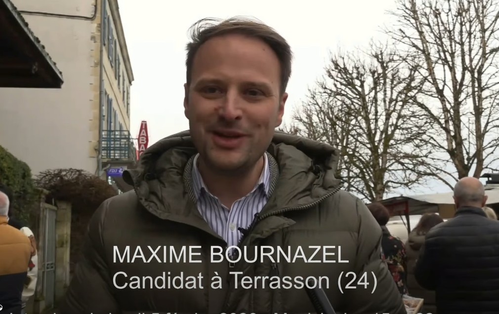 Ewanews : « Maxime Bournazel, candidat aux municipales à Terrasson, vous avez fait votre déclaration de candidature sur Ewanews live déjà en septembre dernier. Nous sommes devant votre permanence au 18 de l’avenue Charles de Gaulle au coeur du marché. Est-ce que l’on peut vous demander de faire une déclaration : pourquoi être candidat aux municipales à Terrasson ?«