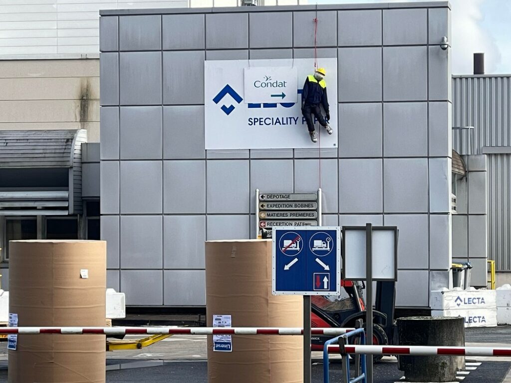 Une cinquantaine de salariés sont venus en bus pour manifester devant le tribunal, tandis que 200 personnes, sans doute plus sur l’ensemble de la journée, se sont rassemblées devant l’entrée de l’entreprise au Lardin. Parmi les personnailités présentes, on notera les maires du Lardin et de Condat-sur-Vézère. L’entrée du site industriel avait été bloquée par des grosses bobines de papier et un mannequin était pendu près du nom de l’entreprise.