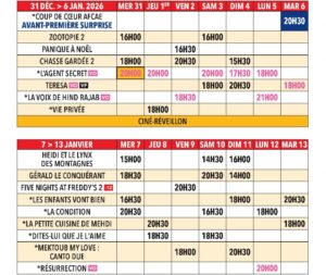Sur l’agenda : Au cinéma Roc de Terrasson ce vendredi 2 janvier à 20h30 : Chasse gardée 2 avec Didier Bourdon ; et La Voix de Hind Rajab en Vost à 18h30. Au Ciné Vox de Montignac : Avatar de feu et de cendres à 14h ce vendredi ; Les enfants vont bien avec Camille Cottin et Juliette Armanet à 20h30 ; Zootopie 2 à 18h.