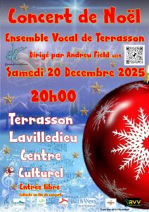 L’Ensemble Vocal de Terrasson sera en concert le samedi 20 décembre à 20h au centre culturel de Terrasson. La chorale est dirigée par le Baryton Andrew Field qui propose des chants traditionnels de Noël, français et anglais. Participation au chapeau. Réservation conseillée de préférence par courriel : willharmo119@gmail.com ou par SMS au 06 52 89 53 53.