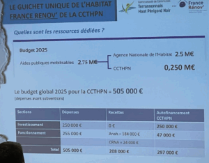 Un réunion sur le thème « amélioration de l’habitat : mieux se connaître pour mieux travailler ensemble » a eu lieu lundi 17 novembre 2025 au siège de la communauté de communes de Terrasson. La soirée était ouverte aux professionnels de l’habitat et à tout public, propriétaires et locataires sous conditions. La salle était comble. Les bons chiffres du Guichet unique de l’Habitat (GUH), France Renov’, ont été présentés. Le budget d’aides publiques mobilisables est pour cette année 2025 de 2.75 M€ et le budget global pour la communauté de communes est de 505.000 €.