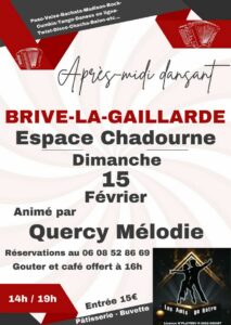 Sur l’agenda : carnaval de Terrasson samedi 14 février à 14h30 départ devant le gymnase ; Merci Téléthon à La Cassagne vendredi 13 février à 19h ; Rugby pro D2 Brive-Agen vendredi à 21h ; concours de belote à Aubas vendredi à 21h (avec le HBCVV) et à La Bachellerie dimanche à 14h (avec le comité d’animation) ; un tournoi de tir à l’arc, le Parcours France Indoor de France Field Tir Libre, à Montignac samedi et dimanche ; Dimanche Passion annulé le 15 février à Terrasson ; …