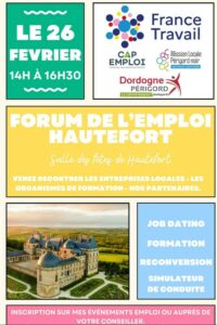 Sur l’agenda cette semaine : formation France Connect mercredi 25 février à 14:00 ; « Un Jacques dans le coeur » avec ICET à la salle polyvalente de Beauregard-de-Terrasson vendredi 27 février à 21:00 ; une soirée irlandaise samedi à Ladornac ; un repas dansant à Fossemagne ; une soirée Résistance samedi 28 février à 20h15 au Ciné Roc avec l’ANACR ; le spectacle Dear & Dearer à l’Esperluette à Limeyrat ; rencontre amicale de tarot dimanche à 14h pour la bonne cause ; rugby derby dimanche à Terrasson…