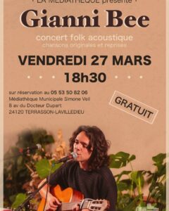 Sur l’agenda cette semaine : le concert de Gianni Bee à la médiathèque de Terrasson (folk acoustique guitare percussions) vendredi 27 mars à 18h30 ; le spectacle de cirque au gymnase du Lardin ce vendredi à 21h avec ICET ; le concert de printemps à Ajat de l’Ensemble vocal de Terrasson samedi 28 mars à 20h ; le Duo Hylia, avec les sœurs Rabatti, concert de musique traditionnelle irlandaise au Séchoir de Saint-Amand de Coly samedi 28 mars à 20h ; La station Champbaudet avec Pacte Tourtoirac samedi 28 mars à 18h ; journée de rugby dimanche 29 mars au stade André Beaudry à Terrasson …