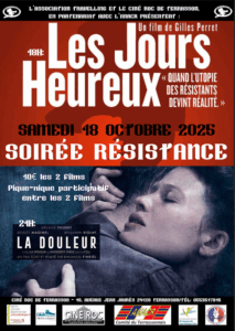 Au programme des deux salles de cinéma… une soirée Résistance au Ciné Roc de Terrasson avec Travelling samedi 18 octobre avec deux films, en partenariat avec l’ANACR, Association Nationale des Anciens Combattants et Ami(e)s de la Résistance : Les Jours heureux à 18h et La Douleur à 21h…