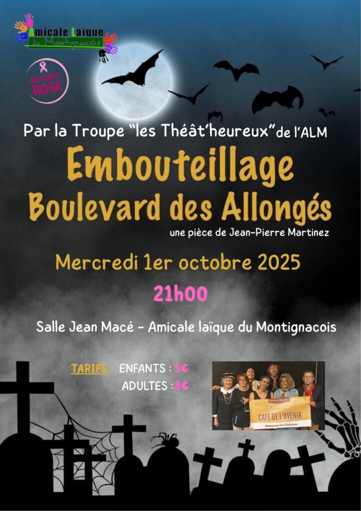 Salle Jean Macé. Théâtre. Dans le cadre d’Octobre rose, l’amicale laïque de Montignac propose « Embouteillage, boulevard des allongés » par la troupe « Les Théâtr’heureux », tarifs : 8 euros (adultes) et 5 euros (enfants). Réservations au 05 53 51 86 88