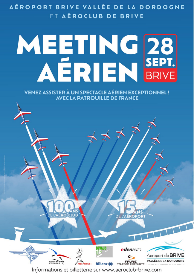 à l’Aéroport de Brive Vallée de la Dordogne (pour ses 15 ans ) et à l’Aéroclub de Brive (pour ses 100 ans), un grand Meeting Aérien avec la Patrouille de France, Rafales et équipe de Voltige de l’Armée de l’Air et de l’Espace, véritable spectacle au sol et dans le ciel sur réservation uniquement en ligne : www.aeroclub-brive.com/meeting28septembre2025