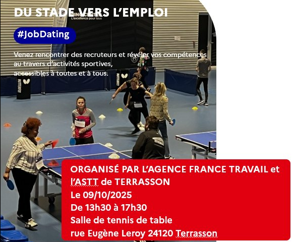 à la salle de tennis de table, « Du Stade vers l’Emploi » est organisé pour la première fois à Terrasson. Sur un après-midi, le jeudi 9 octobre, c’est une rencontre entre employeurs et candidats autour d’activités sportives accessibles à tous, de façon anonyme dans un premier temps et en toute convivialité. Les demandeurs d’emploi peuvent se rapprocher de leur conseiller pour être inscrits.
