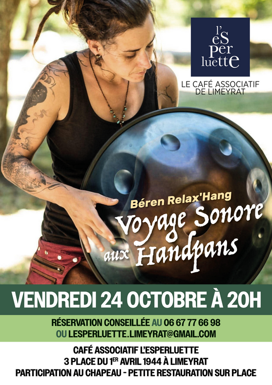 L’Esperluette à Limeyrat reçoit le concert de Beren, vendredi 24 octobre à partir de 20h. « Béren est déjà venue en concert au mois de juin, elle a souhaité revenir à L’Esperluette avec ses handpans, on avait adoré, on espère que vous serez heureux de l’écouter à nouveau vendredi 24 octobre à 20h »… petite restauration et participation au chapeau.