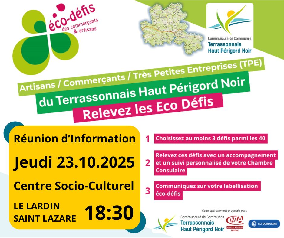 La communauté de communes du Terrassonnais Haut Périgord Noir lance le défi éco-responsable auprès des entreprises, artisans et commerçants du territoire. En partenariat avec la CCI Dordogne et la CMA 24, cette action permet d’accompagner les entreprises locales dans la mise en place d’actions concrètes pour réduire leur impact environnemental, améliorer leurs pratiques et valoriser leur engagement. Les participants bénéficient d’un accompagnement personnalisé et peuvent obtenir le label Éco-Défis pour faire reconnaître leurs bonnes pratiques auprès de leurs clients et partenaires. Première réunion d’information ce mercredi à à 18h30 à Hautefort à la salle des fêtes, 2e rendez-vous au Lardin St Lazare jeudi 23 octobre à 18h30 au centre socioculturel, 3e réunion à Thenon mardi 28 octobre à 18h30, salle des expositions à la mairie, et 4e réunion à Terrasson le jeudi 30 octobre à 18h00 à l’auditorium face à la gare.