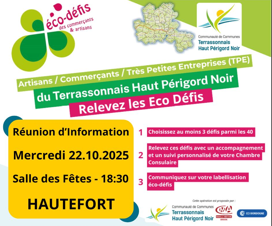 La communauté de communes du Terrassonnais Haut Périgord Noir lance le défi éco-responsable auprès des entreprises, artisans et commerçants du territoire. En partenariat avec la CCI Dordogne et la CMA 24, cette action permet d’accompagner les entreprises locales dans la mise en place d’actions concrètes pour réduire leur impact environnemental, améliorer leurs pratiques et valoriser leur engagement. Les participants bénéficient d’un accompagnement personnalisé et peuvent obtenir le label Éco-Défis pour faire reconnaître leurs bonnes pratiques auprès de leurs clients et partenaires. Première réunion d’information ce mercredi à à 18h30 à Hautefort à la salle des fêtes, 2e rendez-vous au Lardin St Lazare jeudi 23 octobre à 18h30 au centre socioculturel, 3e réunion à Thenon mardi 28 octobre à 18h30, salle des expositions à la mairie, et 4e réunion à Terrasson le jeudi 30 octobre à 18h00 à l’auditorium face à la gare.