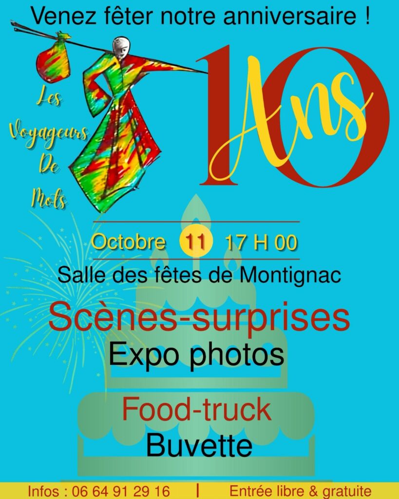 La Compagnie théâtrale Les Voyageurs de Mots fête ses 10 ans. Un florilège de leur répertoire sera présenté avec des extraits de pièces, de la musique, des chansons et quelques inédits. Au total 2h30 de spectacle gratuit avec entractes. Buvette et foodtruck sur place. Une exposition de photos de Didier Thuillot sera à découvrir avec les meilleurs moments de la compagnie. Un petit film sera projeté en boucle.