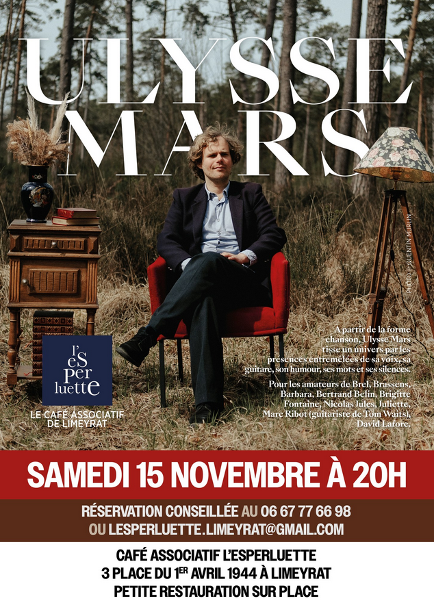 Une soirée Chanson à L’Esperluette à Limeyrat samedi 15 novembre à partir de 20h… En concert, ce sera Ulysse Mars, chanteur auteur compositeur interprète. Participation libre au chapeau et petite restauration sur place pour ceux qui le souhaitent (fabrication maison) avec si possible réservation au 06.67.77.66.98. En savoir plus.