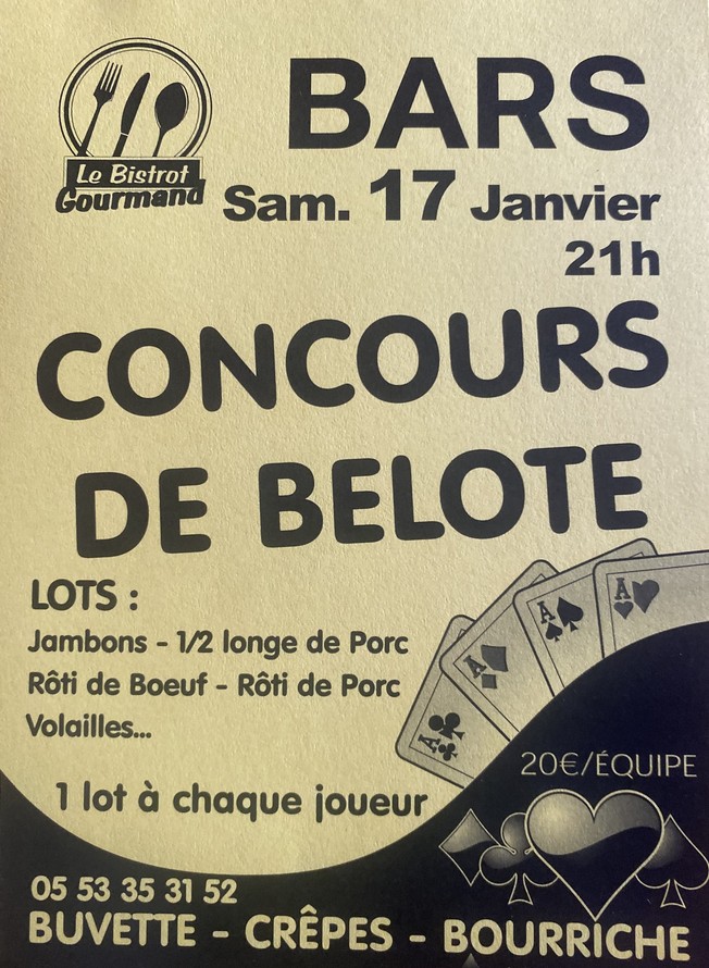 20€/équipe 05.53.35.31.52 buvette, crêpes, bourriche, un lot à chaque joueur, au Bistrot Gourmand