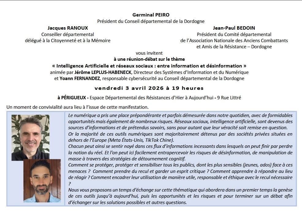 Une réunion-débat sur le thème « Intelligence Artificielle et réseaux sociaux : entre information et désinformation » aura lieu le vendredi 3 avril 2026 à 19 heures à Périgueux, Espace Départemental des Résistances d’Hier à Aujourd’hui, 9 Rue Littré. La rencontre sera animée par Jérôme Leplus-Habeneck directeur des Systèmes d’Information et du Numérique et Yoann Fernandez, responsable cybersécurité au Conseil départemental de la Dordogne. Un moment de convivialité est prévu à l’issue de cette manifestation.