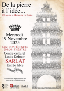 Sur l’agenda : par la Compagnie Théâtrale Les Voyageurs de Mots au Centre Culturel Louis Delmon à Sarlat (réservations au 05 53 31 09 49 – entrée gratuite) dans le cadre de l’événement « De la pierre à l’idée » consacré à Étienne de la Boétie. Quatre conférences à partir de 14h et spectacle à 20h30 : Discours de la servitude volontaire – Ultime Traversée par Étienne de La Boétie